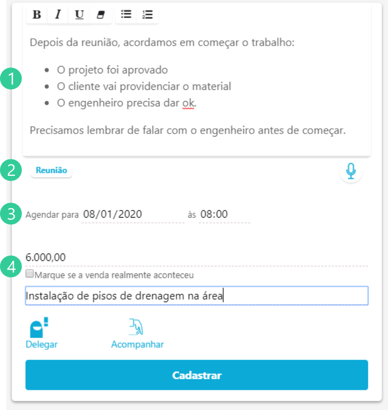 Foi escrito um pequeno resumo da reunião em (1); o tipo de interação foi marcado como “reunião”, ou seja, é rápido perceber que foi resultado de uma interação presencial e não telefone ou e-mail.
