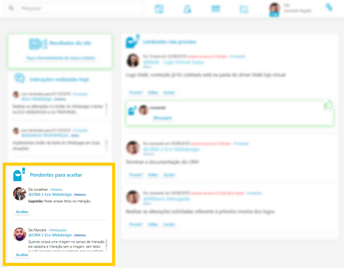 Quando você recebe uma interação, ela ficará na inicial para você aceitar com as informações: nome do contato, data, conteúdo da interação. Como o exemplo abaixo: