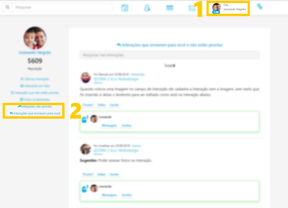 Para ver as interações que você delegou e não estão prontas ou interações que entregaram para você, acesse seu perfil clicando em seu rosto ou nome na barra superior (1) e utilize os dois últimos itens do menu (2), conforme o Item 16.