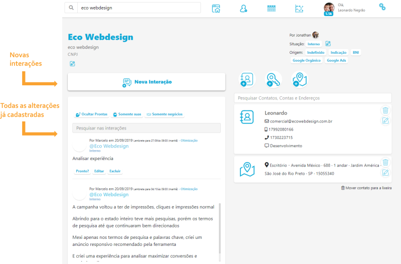 As interações são a base da comunicação e inteligência do CRM, pois é onde estará centralizado o histórico e lembretes de ações de toda a sua equipe.
