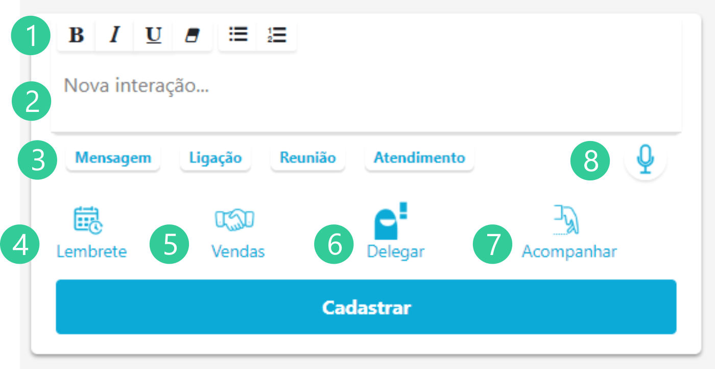 - Tipo de interação: Nós adicionamos por padrão 4 tipos em cada conta, mas você pode inserir ou remover, conforme o Item 19 em Configurações > Opções avançadas.